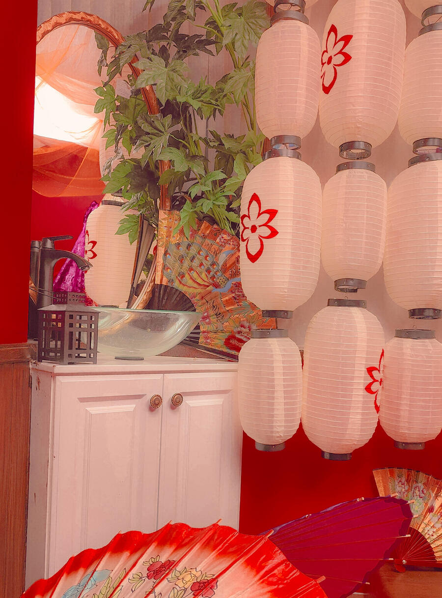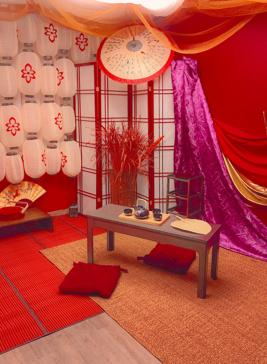 adorned with beautiful paper lanterns, umbrellas, delecate fabrics, and of course a classic tea set